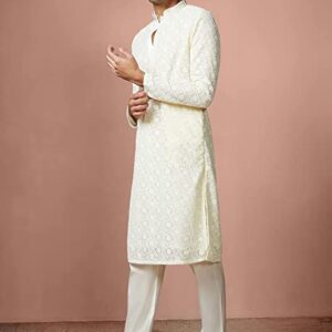 Manyavar Kurta Set for Men, Full Sleeves Mandarin Collar Ethnic Kurta Set for Engagement, Wedding, Party All Over Self Design (Off White)