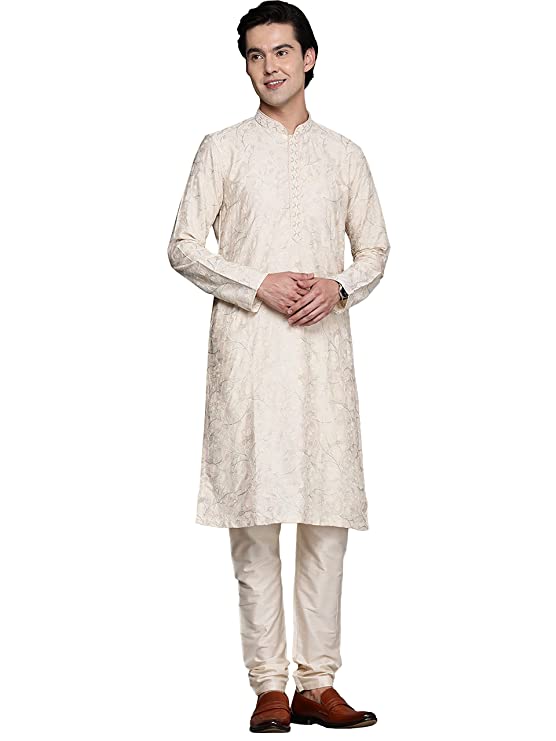 Manyavar Kurta Set for Men, Full Sleeves Mandarin Collar Ethnic Kurta Set for Engagement, Wedding, Party Printed (Off White)