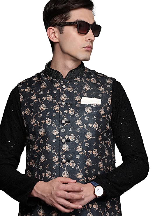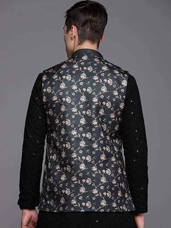 Love contrasts in ethnic outfits? Manyavar brings to you this colour shade jacket that perfectly compliments dark colored kurta set. Try this piece now.